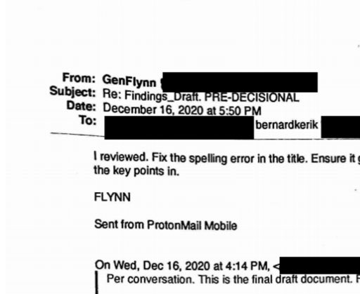 It’s not clear if the order got the legal review Flynn referred to. But the email traffic came at a sensitive moment for Trump allies’ push to keep him in office despite his loss to President Joe Biden. Two days after the first email, dated Dec. 16, 2020, Flynn and others held an Oval Office meeting with Trump to press for drastic action to keep his baseless election challenges alive. The New York Times reported that voting machine seizures were discussed at that meeting.