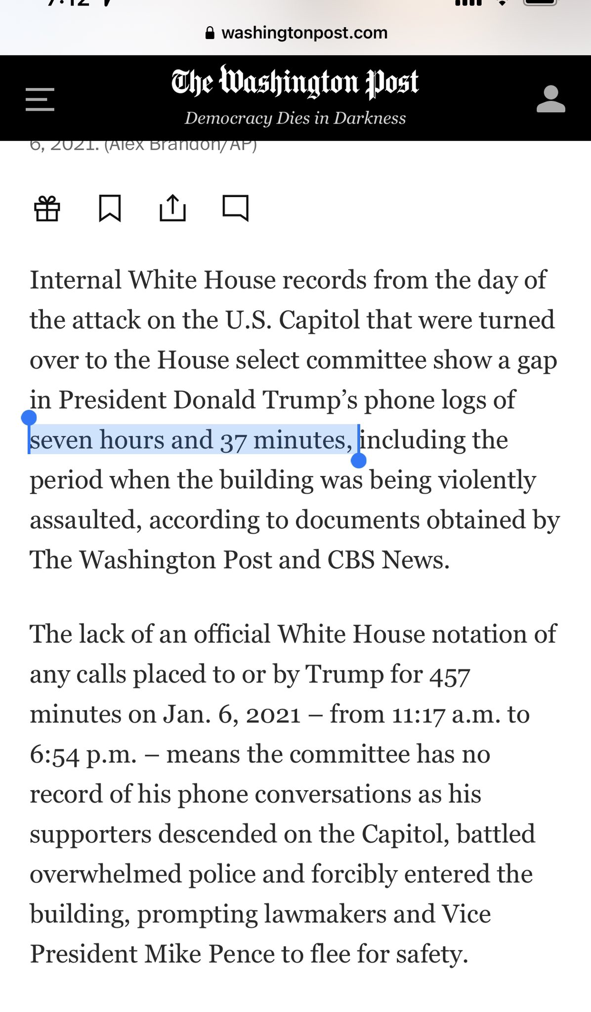 The “gap in President Donald Trump’s phone logs of seven hours and 37 minutes, including the period when the Capitol was being violently assaulted” makes the infamous 18-minute gap in Nixon’s tapes look like nothing in comparison