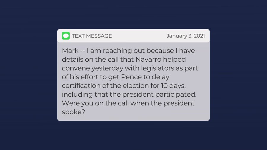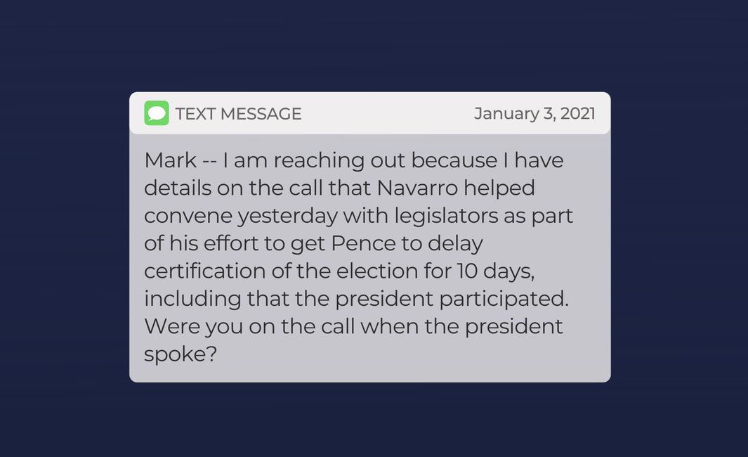 A January 3 text to Mark Meadows: "I have details on the call that Navarro helped convene... to delay certification... including that the president participated..."