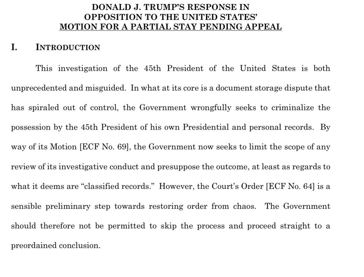 Trump's lawyers double down in their response to the gov't's motion to exempt classified documents from Florida Judge Aileen Cannon's order while on appeal to the 11th Circuit. Apparently, the Republican party no longer believes in protecting our nation's most important secrets.