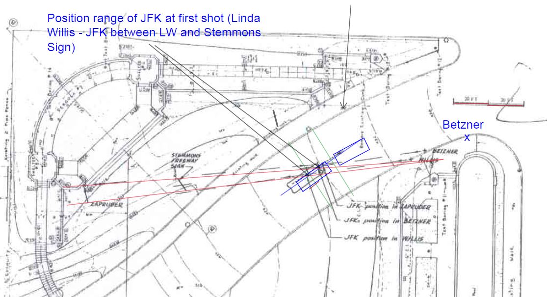 To determine where JFK was when he was between Linda Willis and the Stemmons sign one needs to actually plot the sight line on a map of Dealey Plaza:
