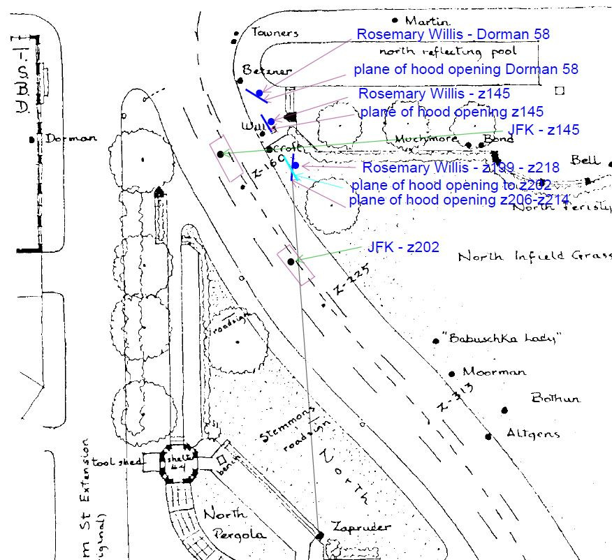 You are suggesting that she is looking behind her prior to z202 even though her hood is facing to her right.  Since we can’t see her face we can’t be sure where her eyes are looking. But if she is looking behind her to the TSBD at z145-z202 why would she then turn farther to her right rear at z202? She said she turned to look back at the TSBD upon hearing the first shot.