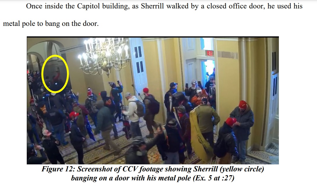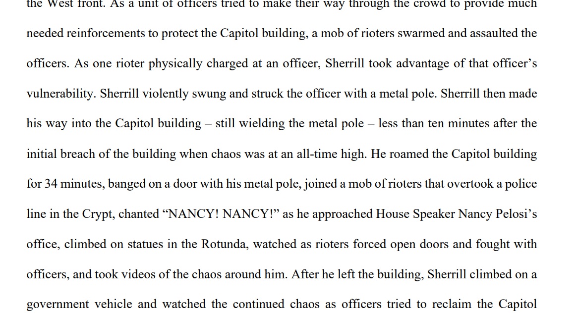 Justice Dept to seek 41 months prison in Jan 6 case of Grayson Sherill of N. Carolina, arguing he "banged on a door with his metal pole, joined a mob of rioters that overtook a police line in the Crypt, chanted “NANCY! NANCY!” as he approached Speaker Nancy Pelosi’s office".