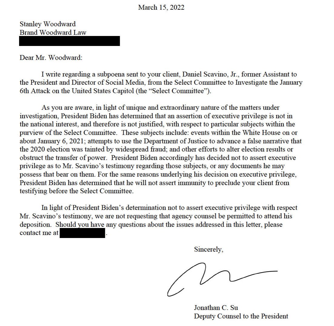 “President Biden has determined that an assertion of executive privilege is not in the national interest, and therefore is not justified,” the White House counsel’s office informed Scavino on March 15, according to the newly posted materials.