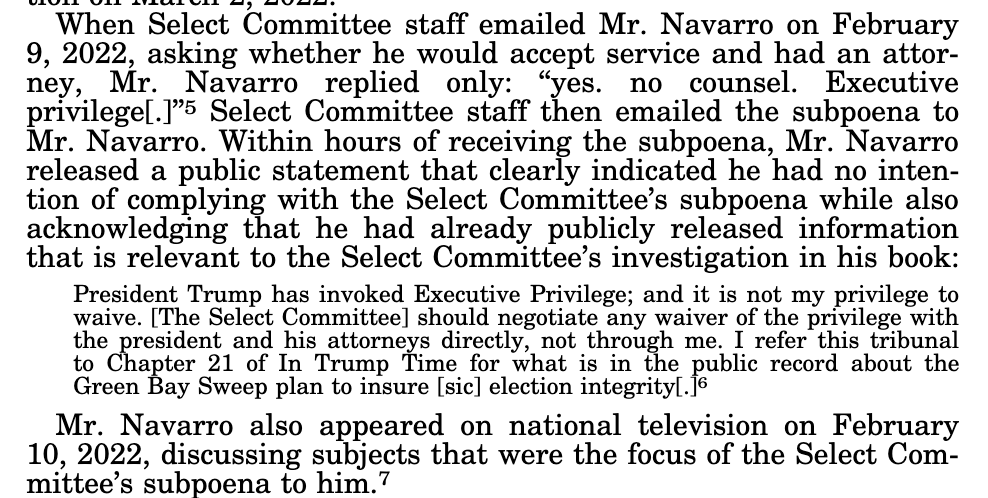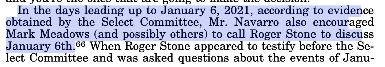 "In the days leading up to January 6, 2021, according to evidence obtained by the Select Committee, Mr. Navarro also encouraged Mark Meadows (and possibly others) to call Roger Stone to discuss January 6th."