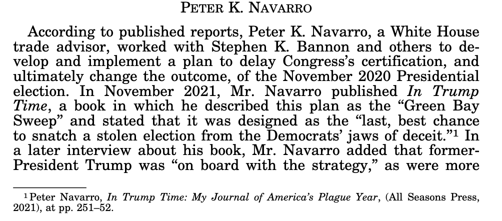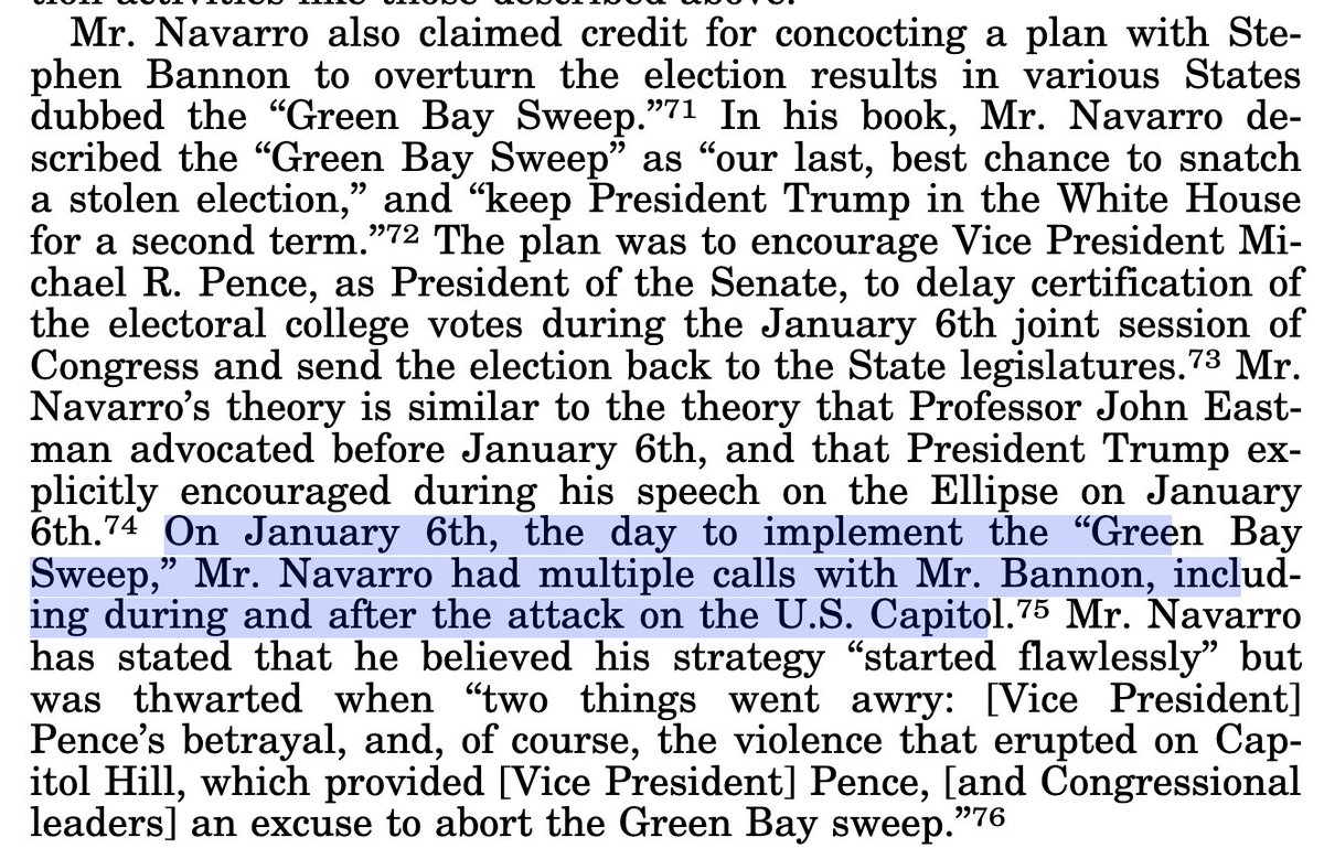 "On January 6th, the day to implement the ‘Green Bay Sweep,’ Mr. Navarro had multiple calls with Mr. Bannon, including during and after the attack on the U.S. Capitol."