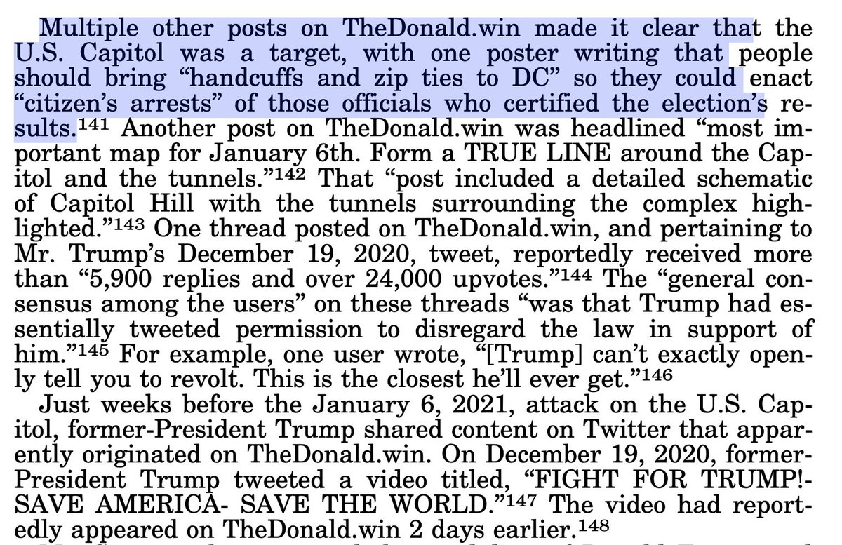 One poster on TheDonald[dot]win wrote that "people should bring 'handcuffs and zip ties to DC' so they could enact 'citizen’s arrests' of those officials who certified the election’s results."