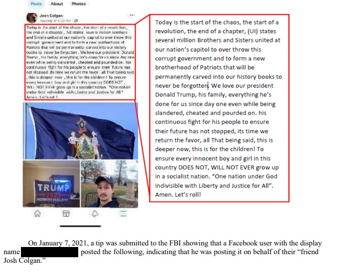 Feds accuse Colgan of posting on social media in Jan 2021 about "the start of the chaos...the start of a revolution.