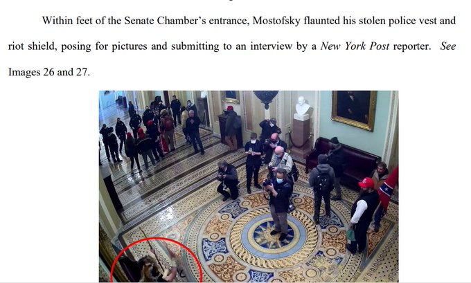 In a weekend court filing, Justice Dept says it'll seek 15 months in prison for Jan 6 defendant Aaron Mostofsky of New York, who was accused of pushing against police barricade, stealing police vest & riot shield, being amid mob that approached Capitol officer Eugene Goodman.