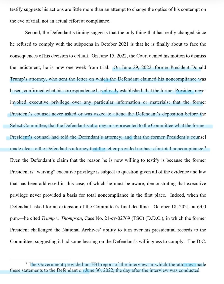 DOJ coming in hot with a filing after midnight saying the FBI interviewed a Trump lawyer and determined Bannon’s counsel lied to the J6 Committee. https://documentcloud.org/documents/22083076-motion-in-limine-to-exclude-evidence-or-argument-relating-to-the-defendants-eleventh-hour-assertion-that-he-is-willing-to-testify