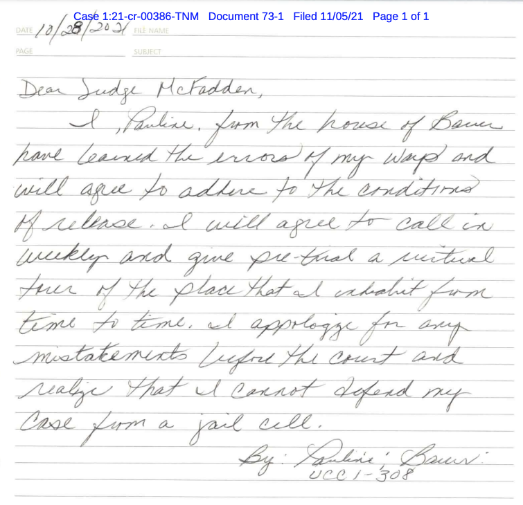 "I, Pauline, from the House of Bauer, have learned the errors of my ways," she wrote to the judge.