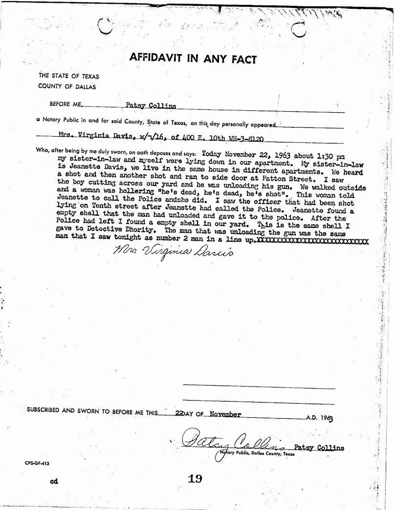 BTW, in Virginia's affidavit, evidently it wasn't just her age that was a bone of contention, but also her gender. Because it would appear, based on what we find typed on the affidavit itself, that Dallas County notary public Patsy Collins thought Virginia Davis' gender was "male". (Maybe this error can spark yet another conspiracy theory surrounding the Davis girls.)