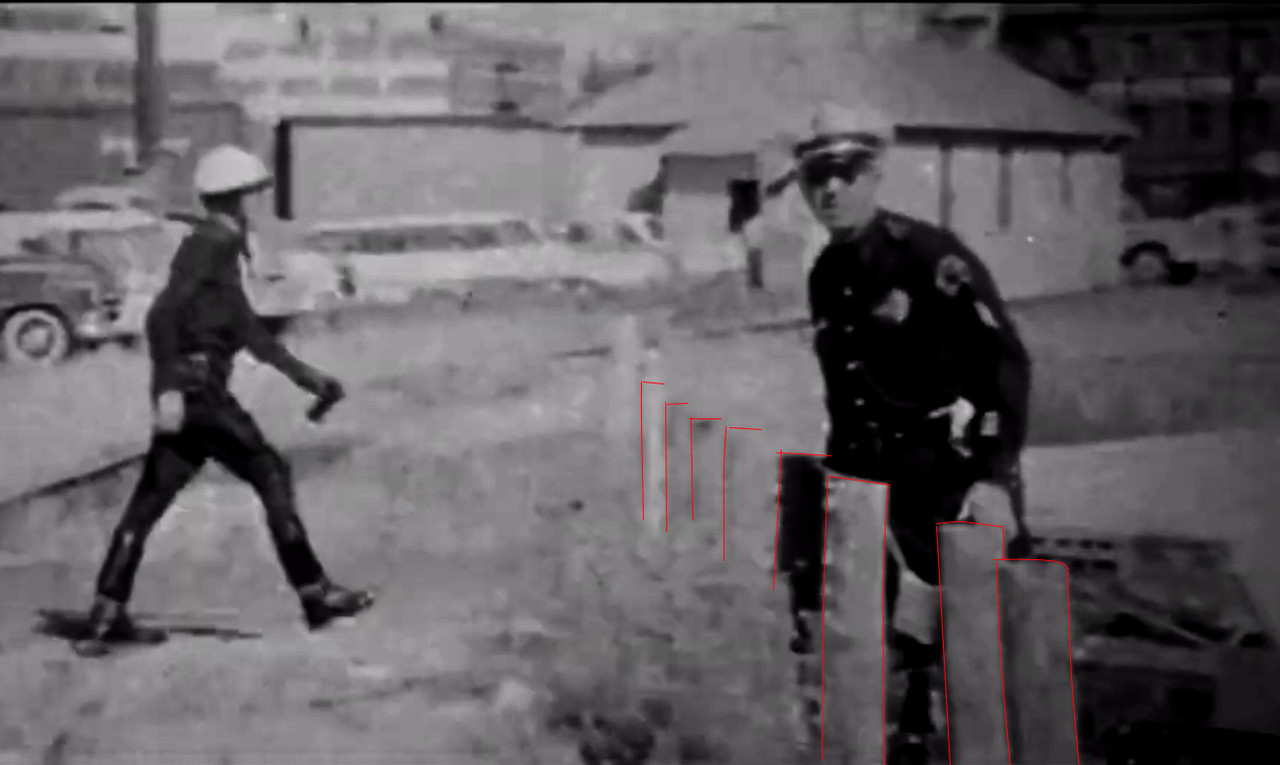 RS: The dirt portion of the Elm St Ext that we see both No Glove Cop and Harkness standing on, does a "Dog Leg" to the viewer's (R)