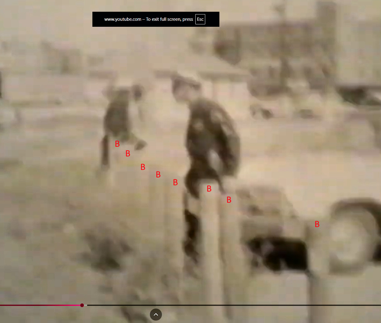 Here, "B" marks where the line of bollards is. You can see that two of them are silhouetted by the MC as he walks behind them: