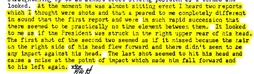 “It looked to me as if the president was struck in the right upper rear of the head. The first shot of the second two seemed as if it missed because the hair on the right side of his head flew forward and there didn’t seem to be any impact against his head. The last shot seemed to hit his head and cause a noise at the point of impact which made him fall forward and to his left again”