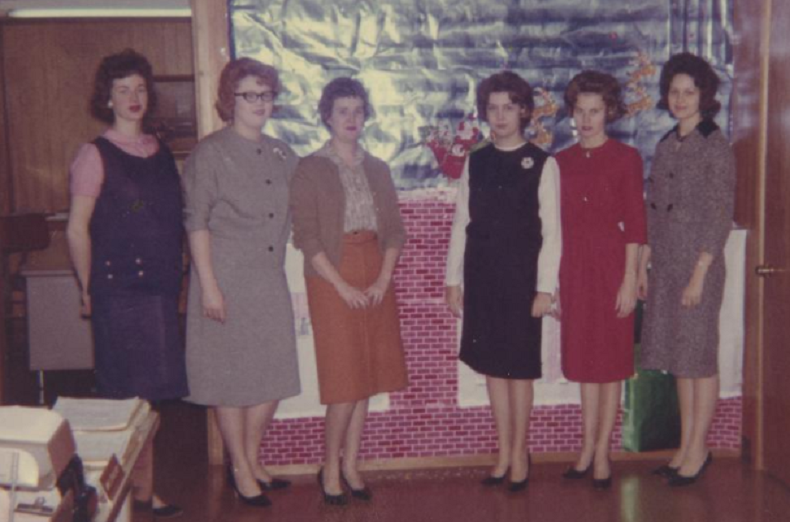 “From left to right in this photo: Woman with dark hair whose name is unknown, Gloria Calvery (red hair, with glasses), Carol (last name unknown), another Carol (last name unknown), Karen Hicks in red, and on the far right, Westbrook.”