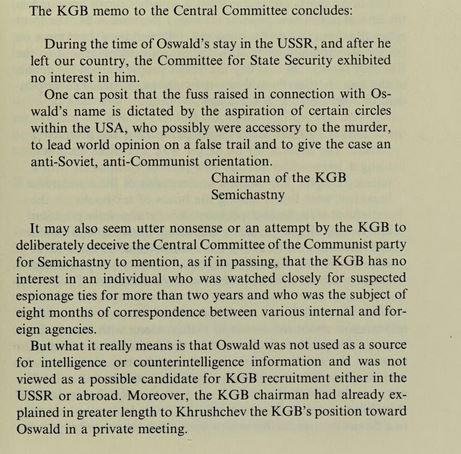 If you want to believe they all lied - Semichastny lied to Khrushchev? - and that all of the files were whitewashed and everything was faked by the "inner" KGB as part of a "Monster Plot" then, well, there's nowhere to go. Whatever evidence that is produced that shows the KGB didn't use Oswald will be viewed as evidence that they did use him. This is the "CIA killed JFK" view where everything showing they didn't kill JFK is evidence they did. Since it's all faked.