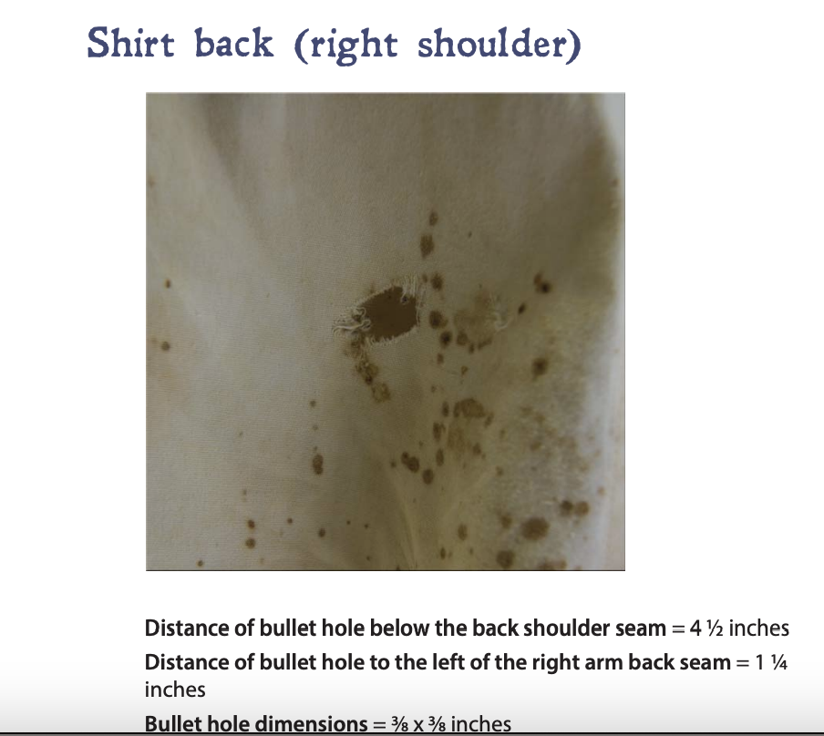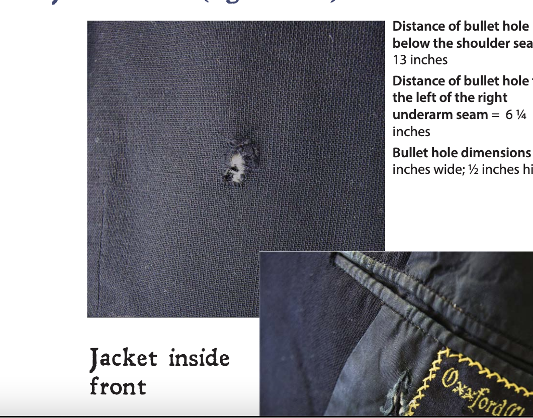 When leaving Gov. JBC's chest, the bullet made a small exit hole in JBC's jacket. 3/8th by 1/2""