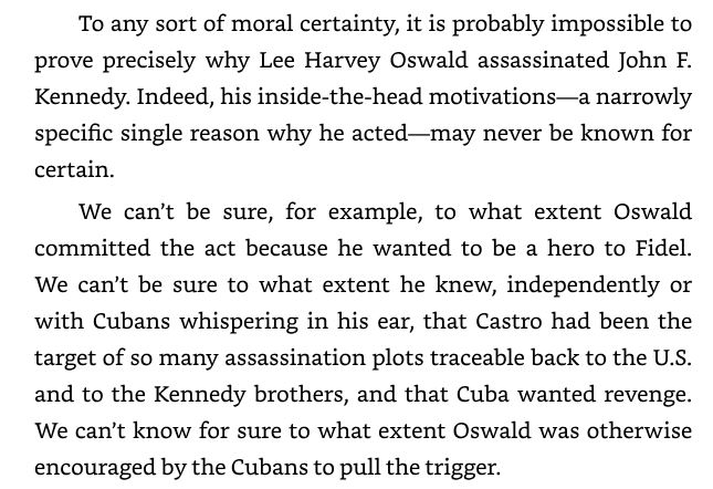 Encouragement, Not Direction: Russo stops short of saying Oswald was a formally recruited or trained Cuban agent. Instead, he describes Oswald as a "self-generating agent" whose actions were encouraged and potentially facilitated by pro-Castro contacts who saw an opportunity to retaliate against the U.S. for its attempts to overthrow their leader.