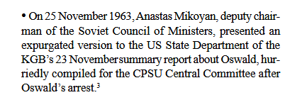Background: Right after the assassination and the arrest of Oswald, the KGB hurriedly put together a report on their involvement with Oswald (Norman Mailer goes over this in greater detail in his book "Oswald's Tale"). Vladimir Semichastny, head of the KGB, then presented it to the Central Committee of the CPSU, specifically Anastas Mikoyan. Mikoyan was a top Soviet official and then deputy chairman of the committee. On November 25, Mikoyan gave a edited copy of that report to State Department officials in Moscow.