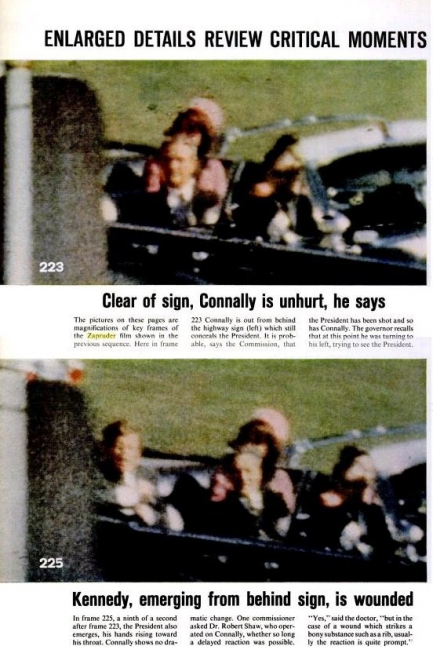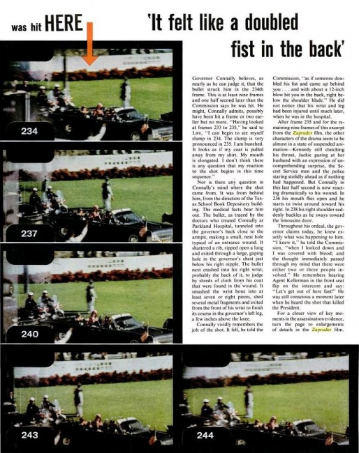 I mean my observation that JBC's jacket suddenly bulged out at Z224 and two frames later both JFK and JBC both suddenly flipped their arms upward in perfect unison. After which JFK is seen leaning forward and to his left with his hands up around his throat and JBC doubles over and dips to his right, gyrates in his seat for a few more seconds before collapsing into Nellie's lap. Yeah, that interpretation. So what's your interpretation of that sequence?