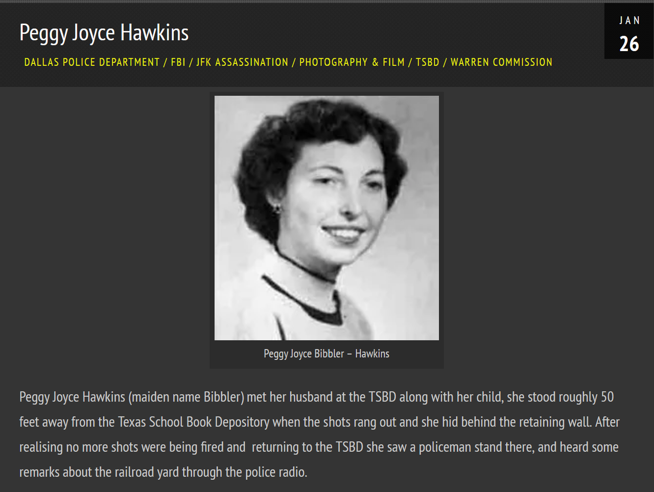 I identified that woman and child as Peggy Joyce Hawkins (né Bibler) and her four-year-old son, Johnny, back in January 2016 at the so-called JFK Assassination Debate - Education Forum.
