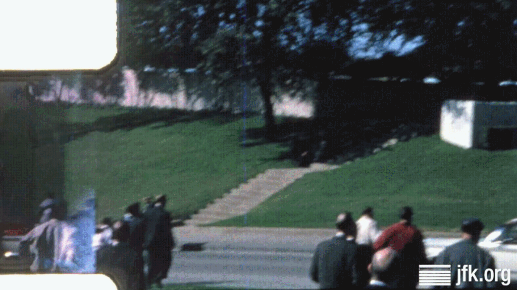 We see Jean Hill and Babushka lady running up the steps leading to the car-park area.
