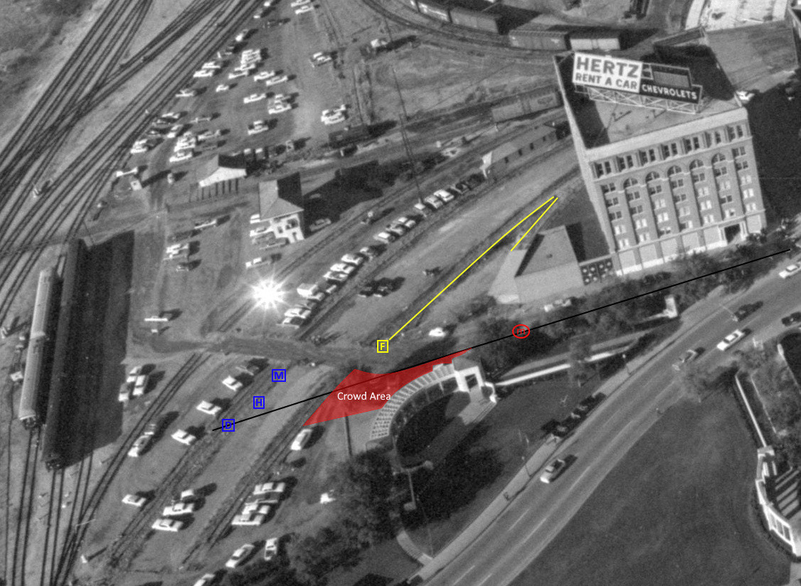 Also again, when Martin is filming Harkness driving Euins down the street, he is standing directly south of the TSBD annex. You can tell by how close the red gates are. That puts Martin to the east of where the crown in Darnell is gathered. The following image shows the area where the Darnell crowd was gathered in red, with Martin's position marked with a red lower-case "m".