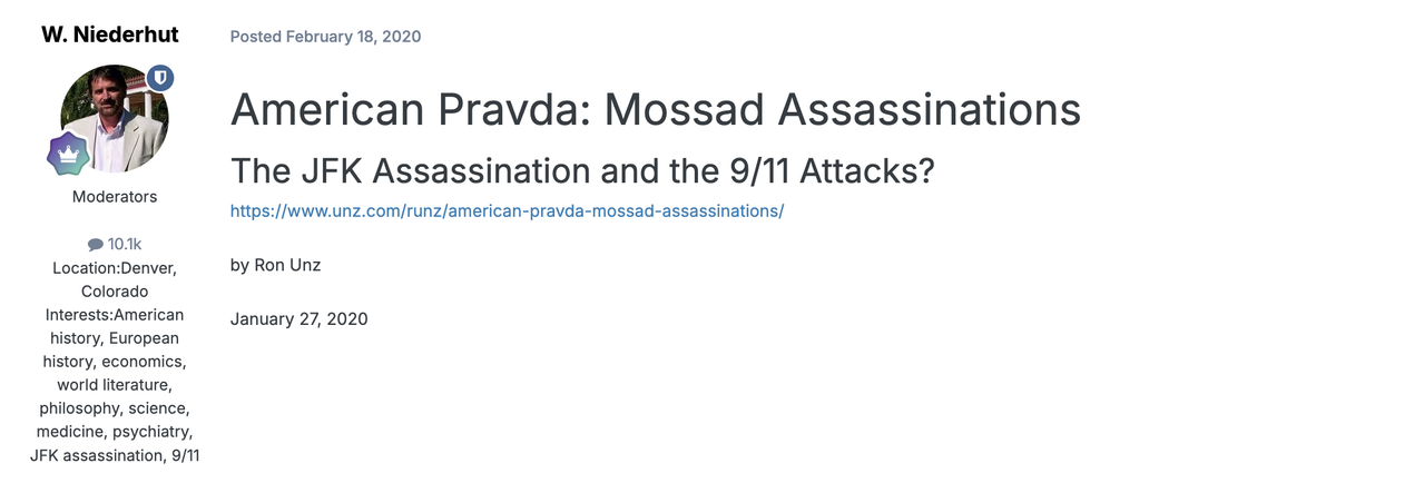 "The JFK Assassination and the Israeli Connection" (July 2021 – Present): In this long-running thread, Niederhut frequently cites the "Talmudic mindset" when discussing the geopolitical motivations of figures he identifies as Zionist hardliners. He often references the work of Michael Collins Piper to argue that religious frameworks influence political covert actions.