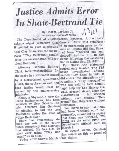 "The Department of Justice acknowledged yesterday that it goofed in ever suggesting that Clay Shaw was the mysterious "Clay Bertrand" sought after the assassination of President Kennedy.