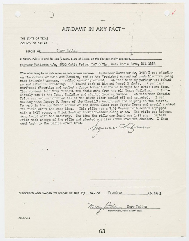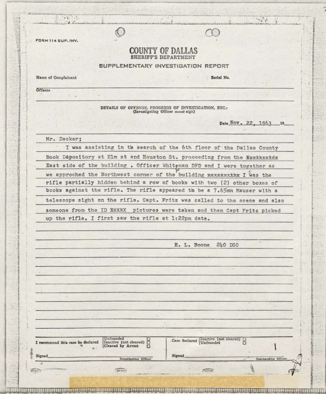 The original Weitzman Affidavit and Boone's Sheriff report. Both describe the rifle in the NW corner, and/or near stairwell and between some boxes. Where Oswald's Carcano was found, photographed and filmed.