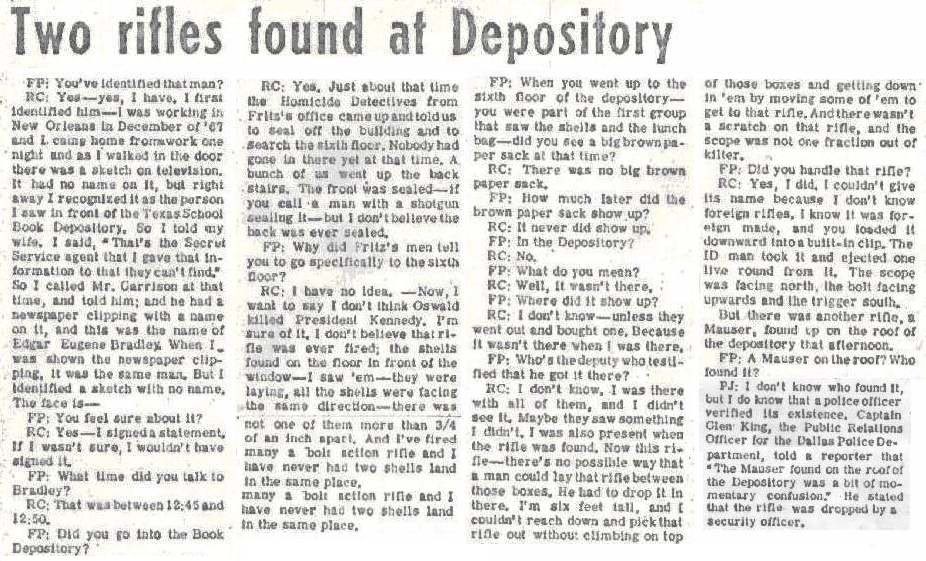 Roger Craig's 1968 interview where he was the only person to describe that the 3 shells in the sniper's nest were facing the same direction and were all an inch apart. Roger also says that he didn't name the rifle because he doesn't know foreign rifles! Very interesting.