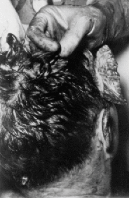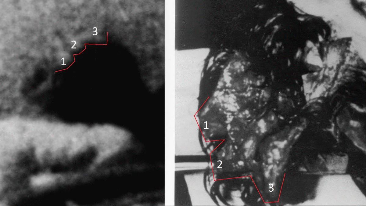 The "red spot" bullet entrance was also photographed twice and when the skin was stretched with differing tautness between the two photos, the back of head entrance wound can be seen to slightly open and close, thus proving the red spot was not merely a pool of blood.