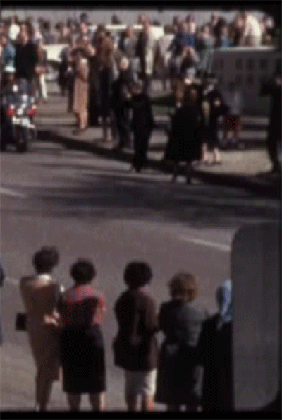 If you will take notice of the gray-haired lady with the black hat who has her left arm and purse blocking the Zapruder’s camera’s view of Rosemary’s right side; you should be able to see that the lady’s right arm is raised up high. What is interesting about that is that she appears to be pointing directly at the sniper’s window. And there is a large gap in the motorcade between the queen mary vehicle and the VP vehicle. So there is no vehicle in the direction (where one might thing she is looking and waving). See the animation image below from the time of the Z141 frame.