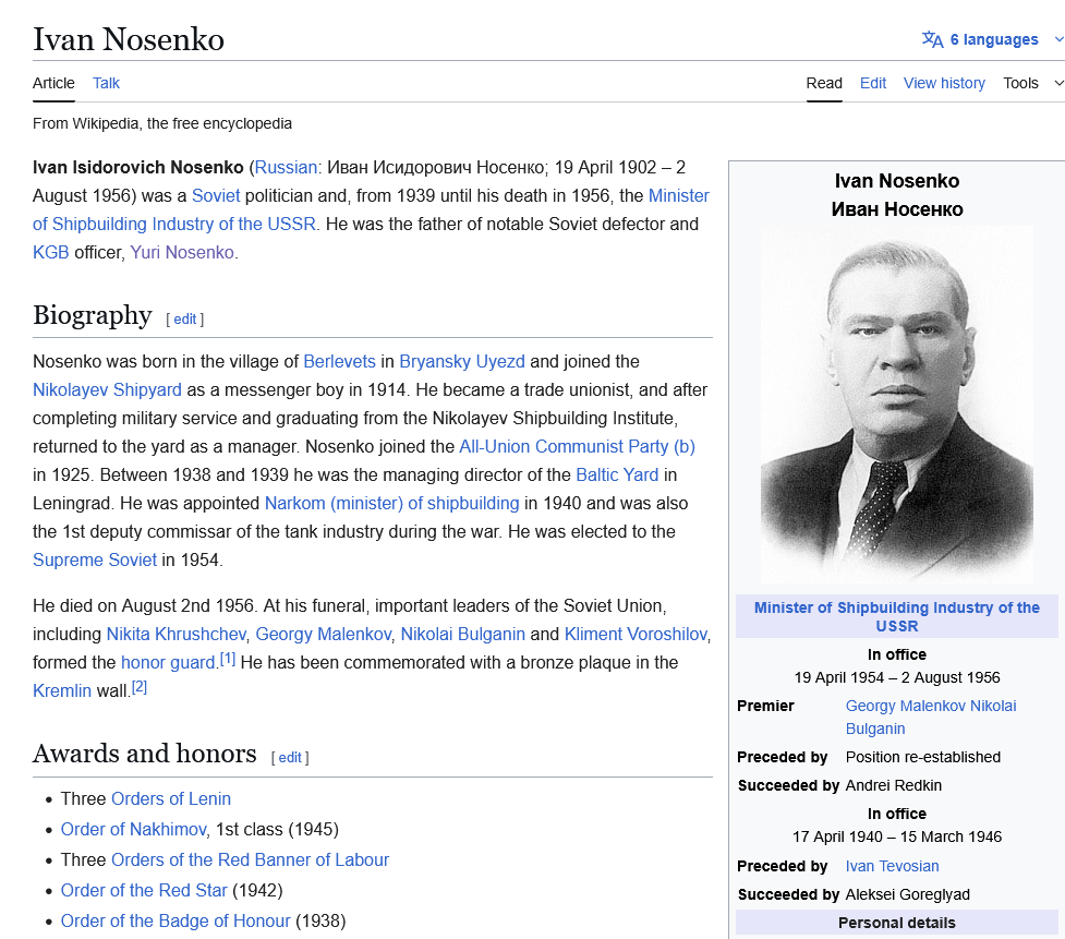 Nosenko's father was a relatively important and honored official in the Soviet Government, Ivan Nosenko. He was awarded three Orders of Lenin, the highest civilian award the Soviets gave out and after his death his funeral was attended by top Soviet officials including Khrushchev. In fact, Khrushchev was one of the honor guards at the funeral.